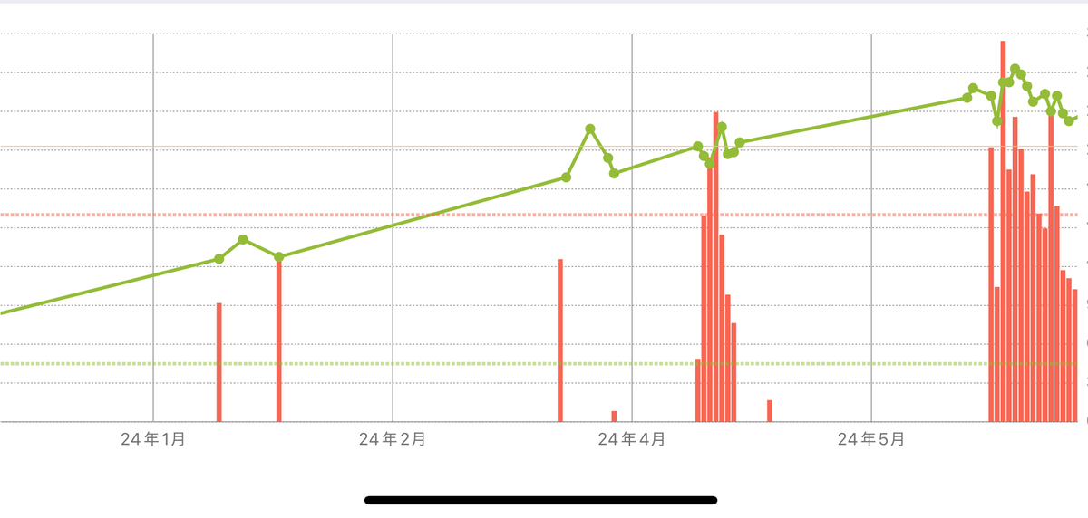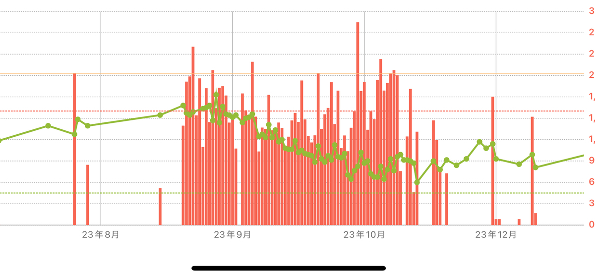 続けられている時に、体重や食事の記録、運動の記録があったので、見直すことができました。「太っていく時期は心理的に余裕がない」という示唆から、自分はドカ食いによってストレス解消をしていることが定量的に明らかになりました。記録が続いている時期は緩やかに体重が減少していました。これは健康的に痩せていると言えそうです。